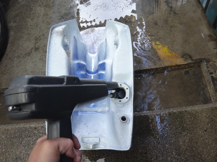 高圧洗車機で水と洗剤を使って洗浄します。出来るだけ全体的に洗えるよう上から下から多角的に洗ってください。
